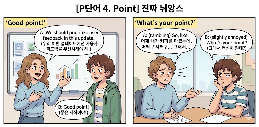 - 진짜 뉘앙스: 대화 중에 "Good point!"라고 하면 "좋은 지적이야 / 네 말이 맞아!"라는 강한 동의의 표현입니다. 또한, "What's your point?"라고 하면 "그래서 하고 싶은 말이 뭔데? / 핵심이 뭐야?"라며 살짝 따지는 뉘앙스가 됩니다.