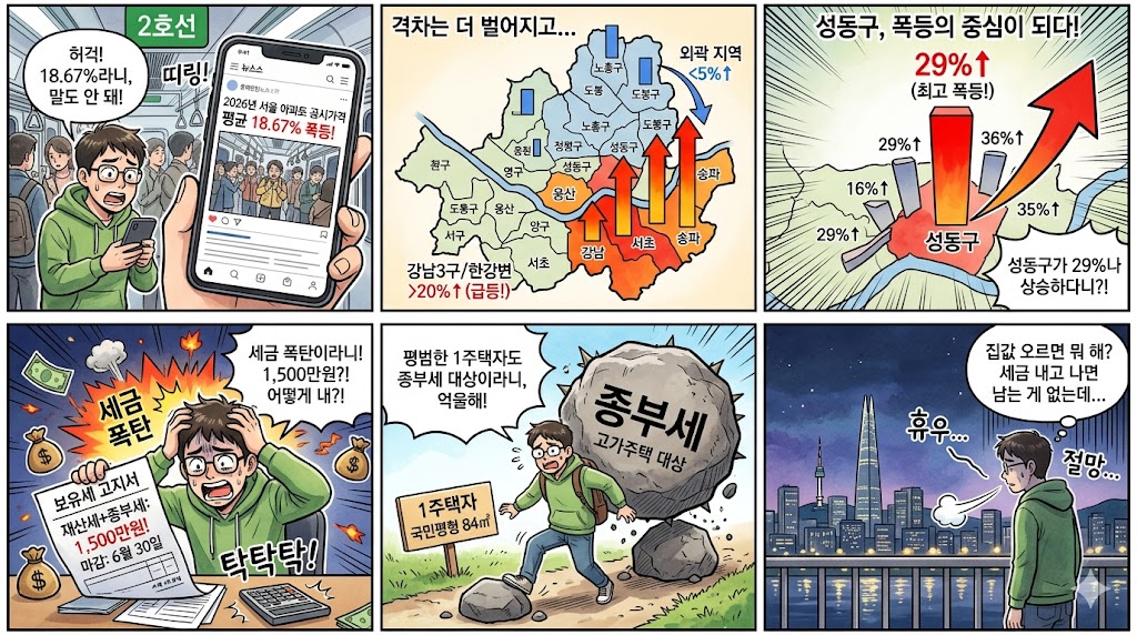 이번에 발표된 2026년 서울 아파트 공시가격은 작년 대비 평균 **18.67%**라는 믿기 힘든 폭등세를 기록했습니다. 이는 전국 평균 상승률을 훨씬 웃도는 수준으로, 서울의 집값 상승세가 얼마나 거셌는지를 단적으로 보여주는 지표입니다.